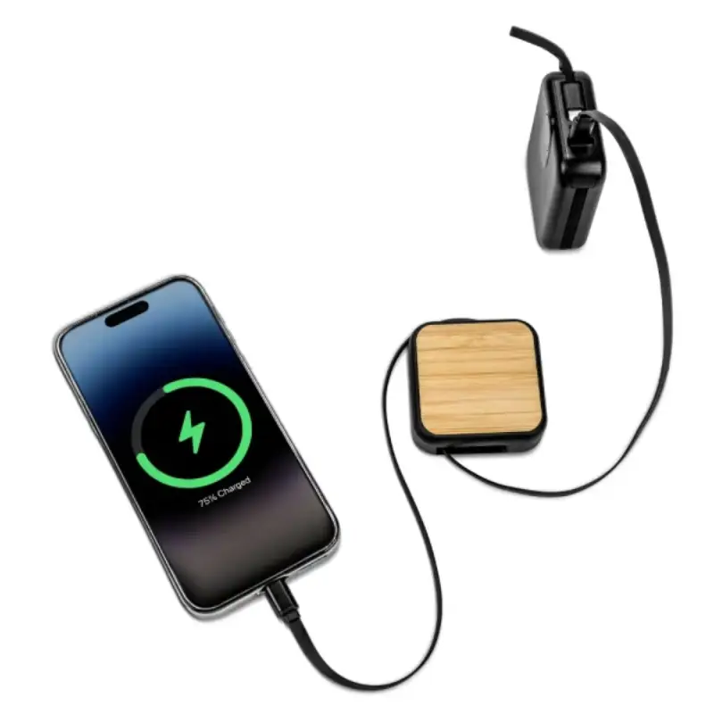 The retractable design keeps cables tangle-free and easy to store, making it ideal for travel, office desks, and daily commutes. The bamboo top adds a refined, natural touch that complements professional environments while offering a subtle branding surface for SignArt gifting.